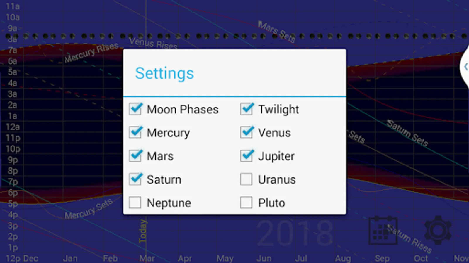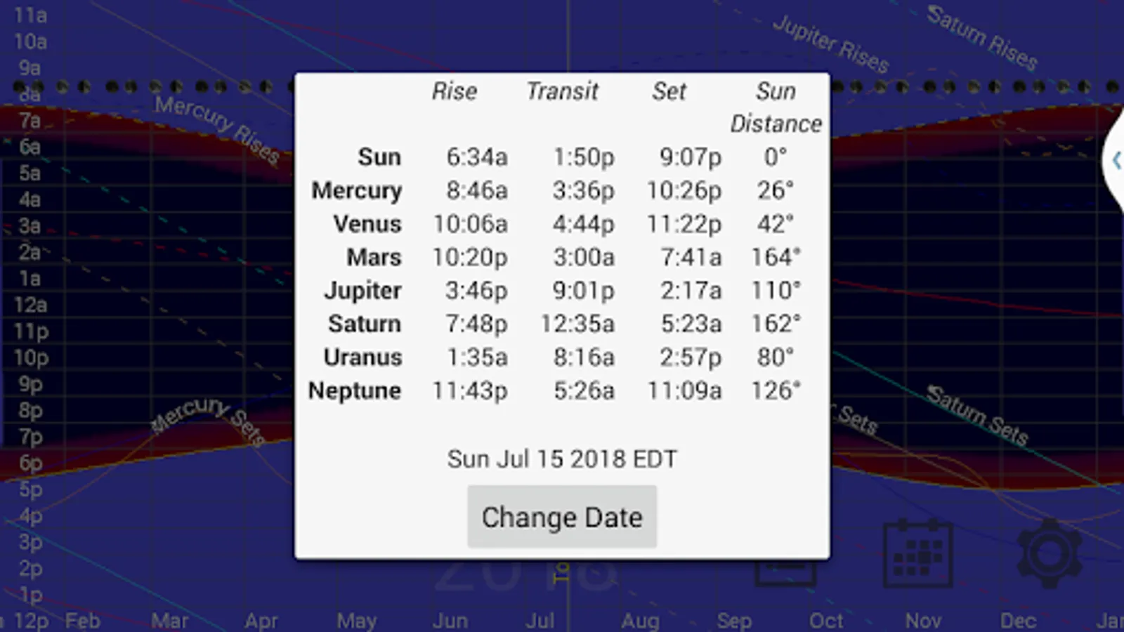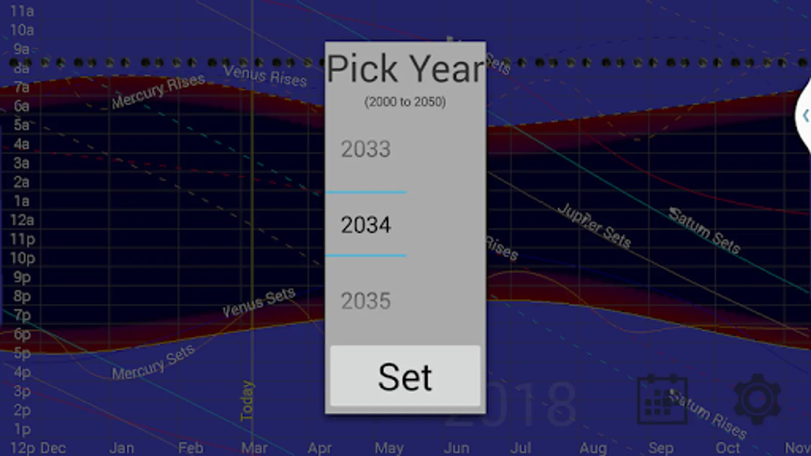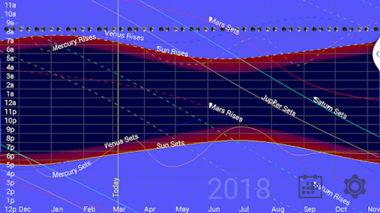 Useful for determining when a planet will be visible. This application shows a graph of the rise and set times for all of the planets from 2000 to 2050. It also show sunrise, sunset, astronomical twilight times, and moon phases. The planets visible to the naked eye are defaulted to on (Mercury, Venus, Mars, Jupiter, Saturn), but Uranus, Neptune and Pluto are available in the options. The app uses the devices GPS unit to show rise and set times for your particular location. Note that all times are standard time, so you will need to add or subtract an hour to account for Daylight Savings Time when in use.