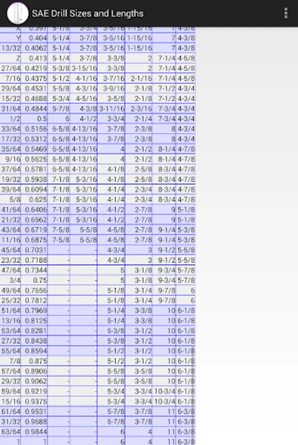 Drill bit chart showing diameter of common SAE drill bits as well as the overall length and flute lengths for Jobber, Screw Machine, and Taper drills. This app requires no permissions.