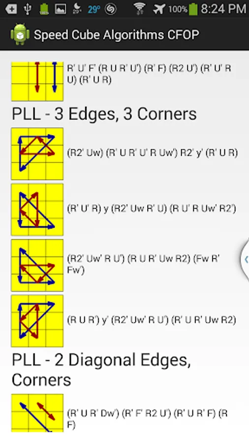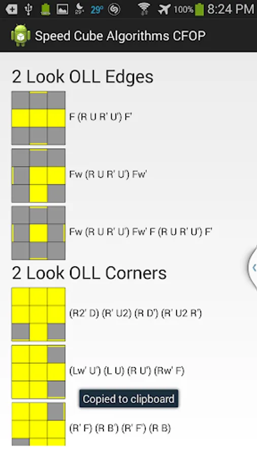 This app simply shows reference diagrams for the 2-Look OLL CFOP (Fridrich) method of solving a Rubik's Cube. This is intended for use as a reference for people learning the CFOP method. The CFOP method is the most common method used among speed cubers, it is not designed for beginners who are just learning to solve the cube for the first time. The 2-Look OLL CFOP method is for those that want to limit the number of algorithms they have to memorize for the orientation step from 57 algorithms to just 10. The algorithms presented here are the most popular ones used, and are designed to be fast, rather than short.