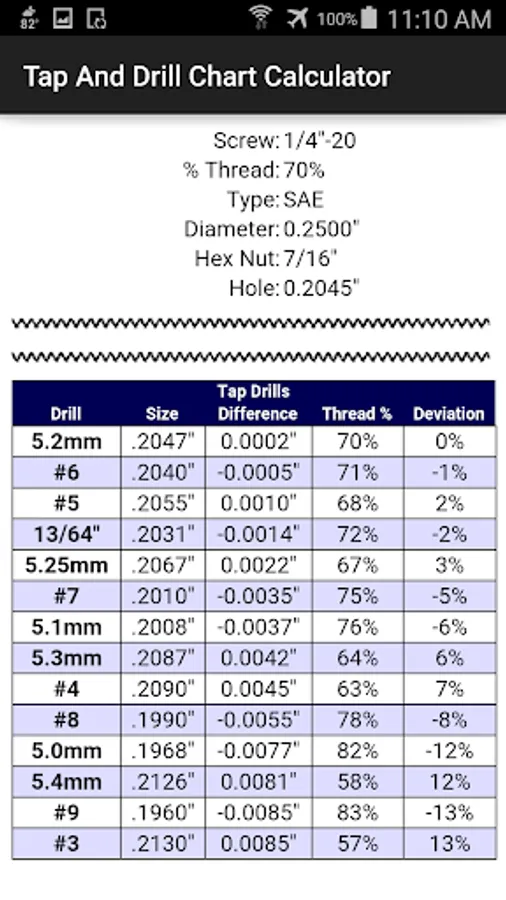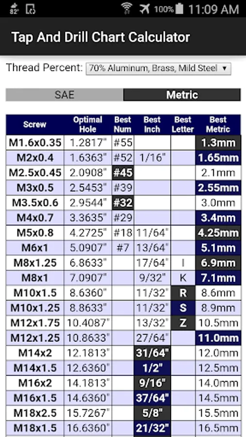 App to calculate charts for various thread percentages for standard SAE and Metric screws. Also shows hex nut size and a diagram with the screw threads to check TPI/TPMM and screw diameter.