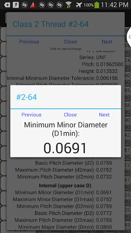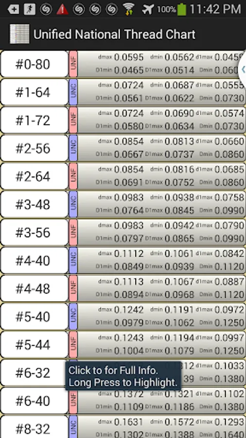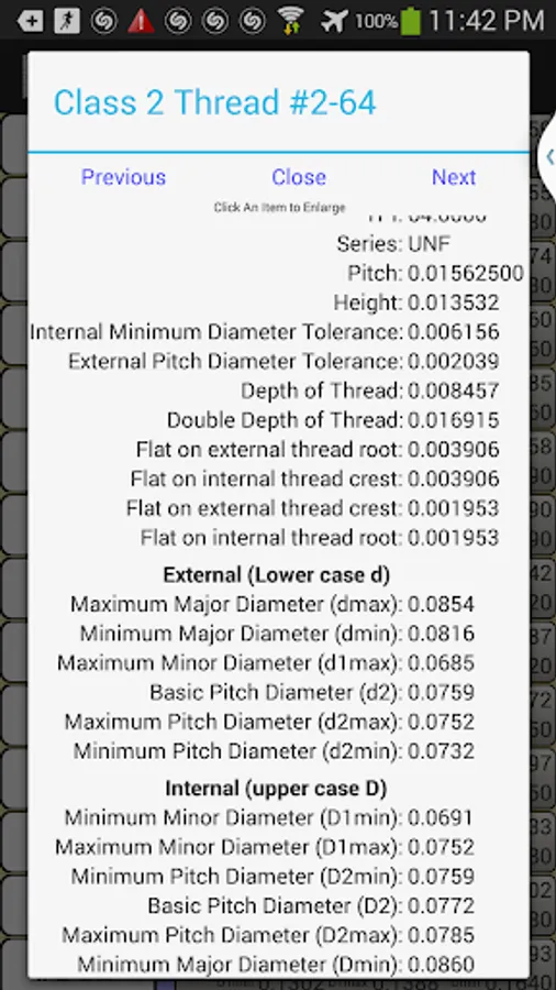 Displays detailed information on threads for inch/SAE thread sizes according to the ASME B1.1 standard for Unified National Inch Screw Threads. The data in the application are computed from the formulas given in the ASME B1.1 standard, and as a result may be off by .0001" due to rounding used in the standard. So anyone needing more precise data should consult the standard directly. Some other numbers are rounded to less than 1/10000", but this app still displays them to 1/10000". Adhering to the numbers in this app will still be within the standard though. It also shows far more detail than is listed in the tables in the standard, see screenshots to see what information is displayed.
