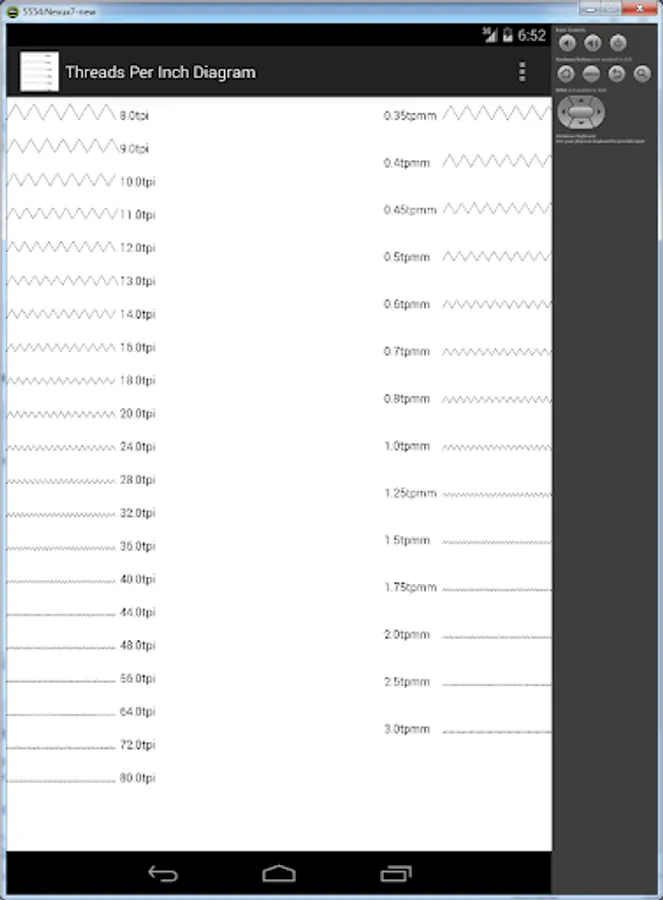 Displays an actual size diagram of both US SAE thread pitches and metric (mm) thread pitches. If you have a bolt or screw and want to identify it, use this app to identify it by matching up the threads on the screw with the diagram on screen.