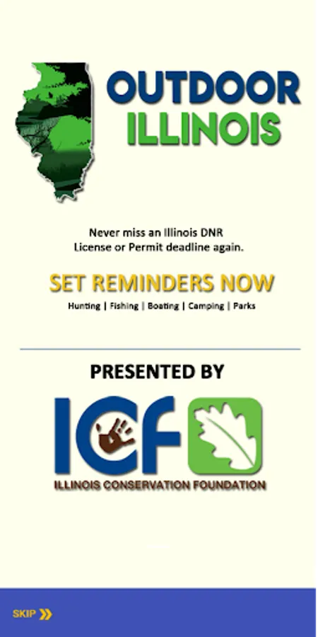 Outdoor Illinois is presented by Illinois Conservation Foundation (ICF). It is an app intended to provide Outdoor Enthusiasts information related to Game and Fishing activities in the State of Illinois. It reflects the Department of Natural Resources Hunting and Fishing Digest providing the capability to set reminders on season schedules and application deadlines.