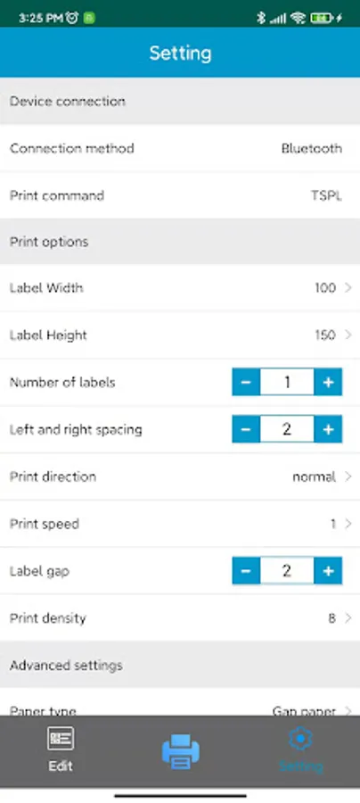 The application is used to print labels. The mobile phone connects the printer device through Bluetooth or USB. Edit the content you want to print on the mobile phone, click the print button, and send data to the printer