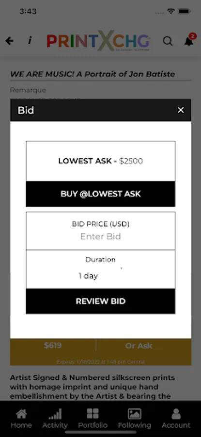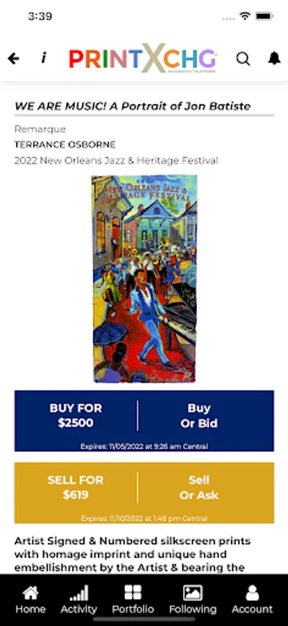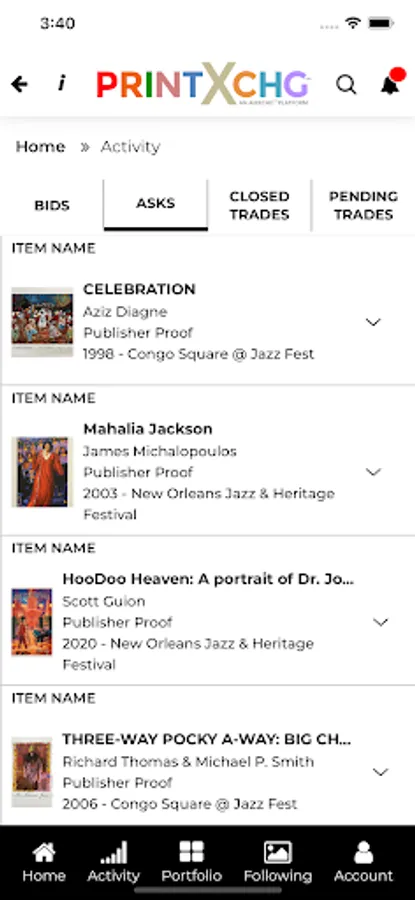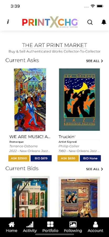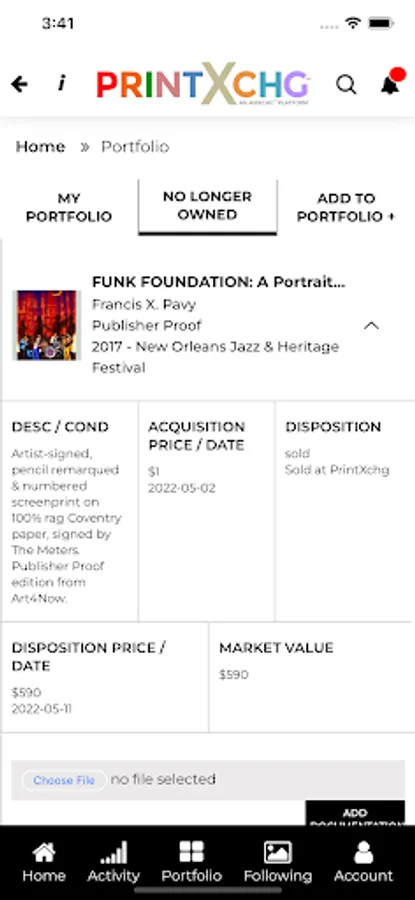 - BUILD AND TRACK YOUR PORTFOLIO. PrintXchg transactions are automatically added to your portfolio, where their values are updated as prints trade. Works bought elsewhere can be added. Portfolio items can be posted for sale with a single click. If a Buyer bids for an item in your Portfolio that you haven’t posted for sale, you’ll be notified if you requested that notification.