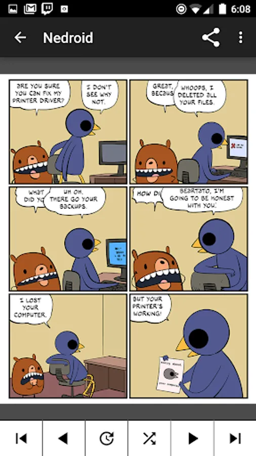 * Quick and simple navigation - supports swiping to go back and forth, as well as offers buttons to go to first, previous, random, next and last web comics. Also allows pinch and double tap to zoom. Please note not every comic / cartoon allows you all of those navigation options so some of these will be disabled depending on which comic is being read.