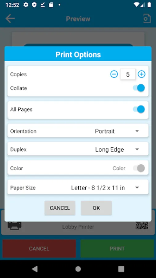 • Select print options for your documents such as duplex, paper size, copies, page range, collate and color output