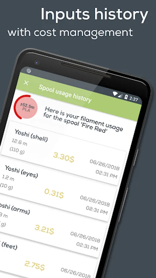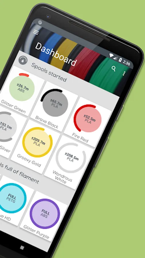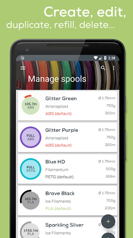 This application will help you to manage your stock of filament spools. Just insert your spools in the base, and input the length (or weight) of filament you use!