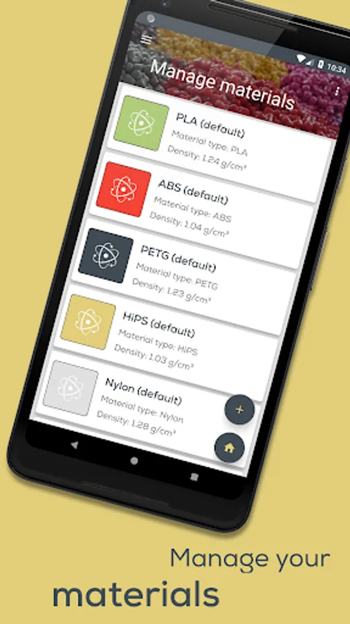 You can also manage the different materials (PLA, ABS, PETG...) with a pre-loaded set including the density of each materials. Create your own exotic materials!
