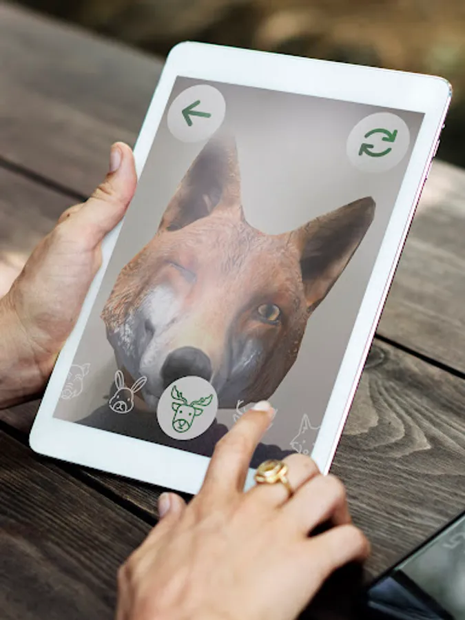 The FIÉK AR “Selfie” application has retained the function of the original Experience Forest AR application, that we are able to visualize forest animals in our own environment in 3D. In addition, however, the House of Nature is also full of beautiful nature photos. By directing the application to such an image, the parallax is displayed in 3D, so visitors can truly experience the beauty of the forest environment. Also, from what the AR application got its name from: we have also included a selfie filter, with which you can place the image of forest animals on your own face and smile into the camera as, for example, a deer or a sly fox. The app tracks facial expressions, so the result was particularly entertaining. For this, we have created a selfie wall, where the AR content will be displayed after scanning the marker.