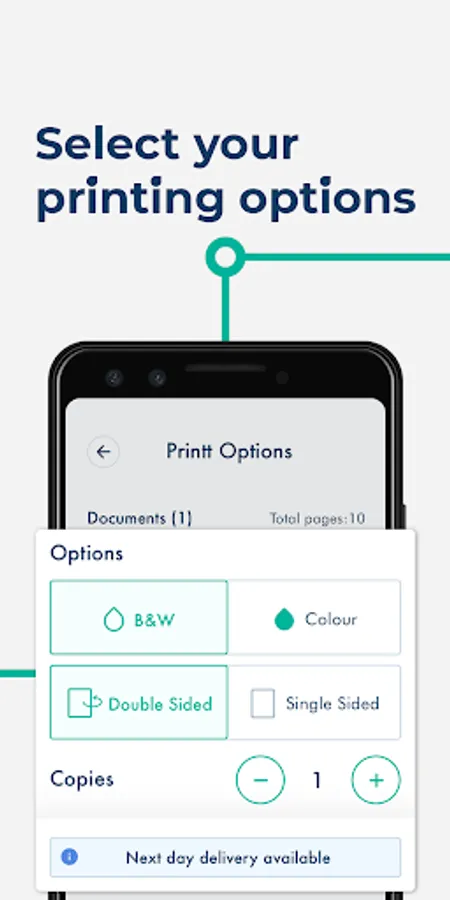 Black and white printing, colour printing, double sided printing, find all essential options on the Printt app.