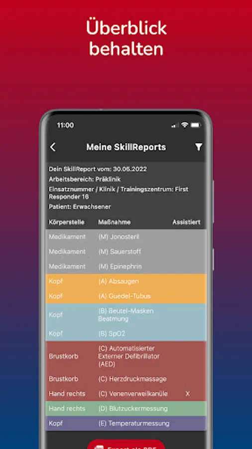 SkillReport enables you to collect, store and send your emergency medical measures. Thanks to the intuitive user interface, you can create your SkillReport with just a few clicks. Input, processing and storage are possible without an existing internet connection. Search your database using the filter function and export your SkillReports as PDF to all the institutions that are important to you. SkillReport currently enables interprofessional access for Germany, Austria, Switzerland, South Tyrol and Liechtenstein.