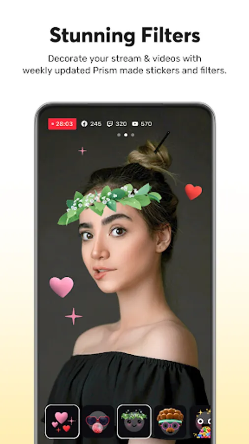 Spice things up with various effects like unique masks, background filters to change the mood, touch filters to show reactions, and stylish filters.