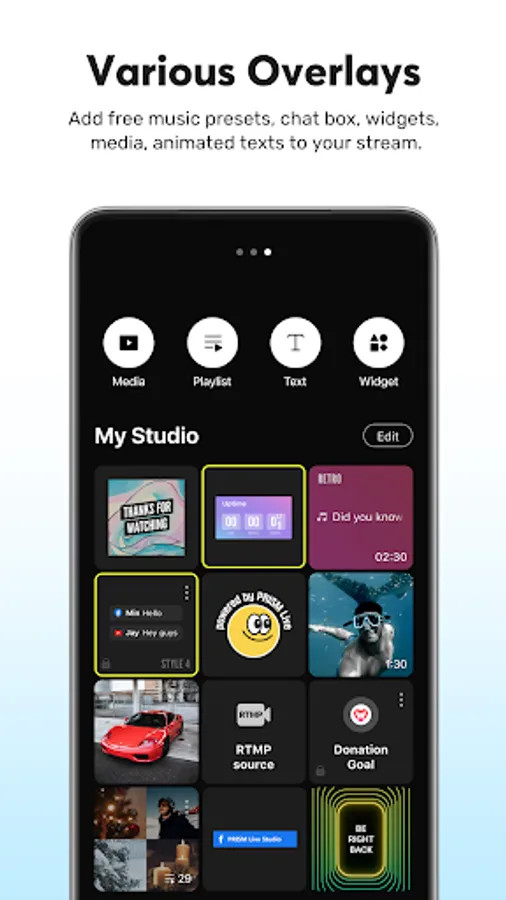 Add simple text overlays or choose an animated theme from Title, Social, Caption, and Element to decorate your live stream.