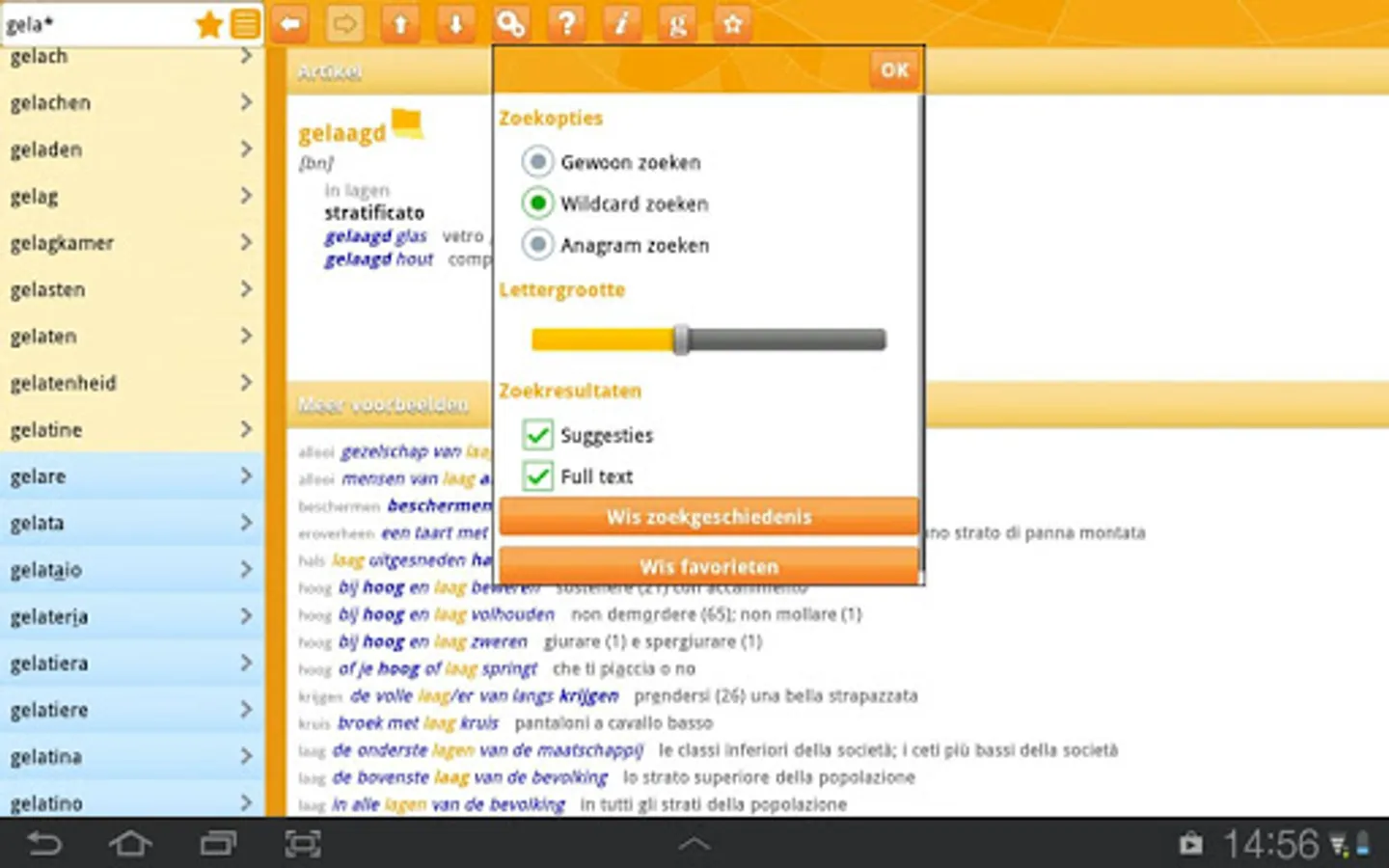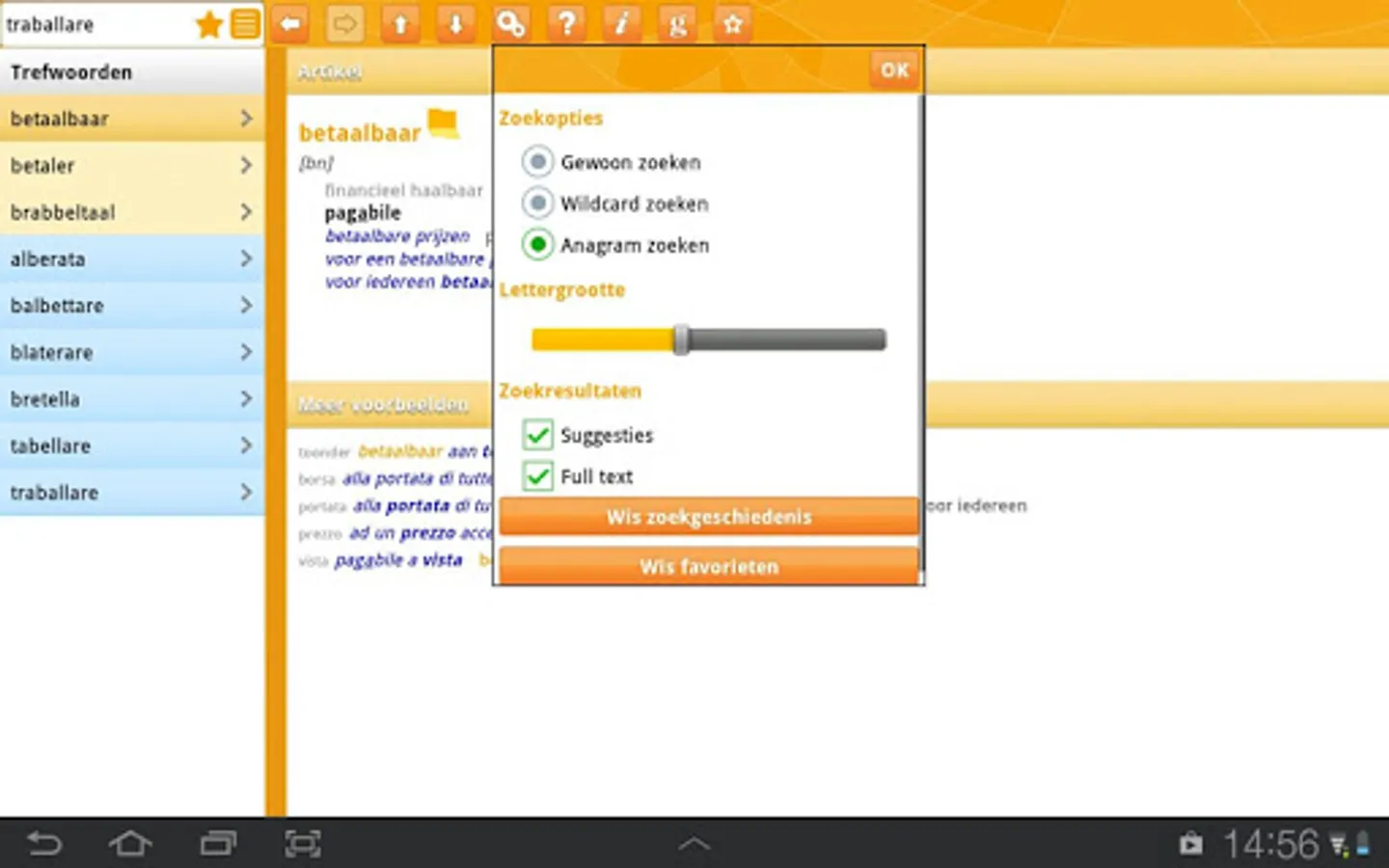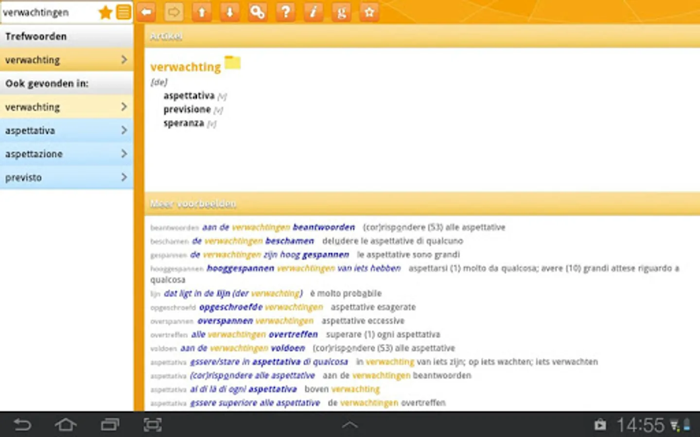 • Full-text search result: search for a word and you immediately see all the occurrences of it in the dictionary, in both translation directions, in all example sentences and translations, complete and clear. This way you choose the right word in every situation.