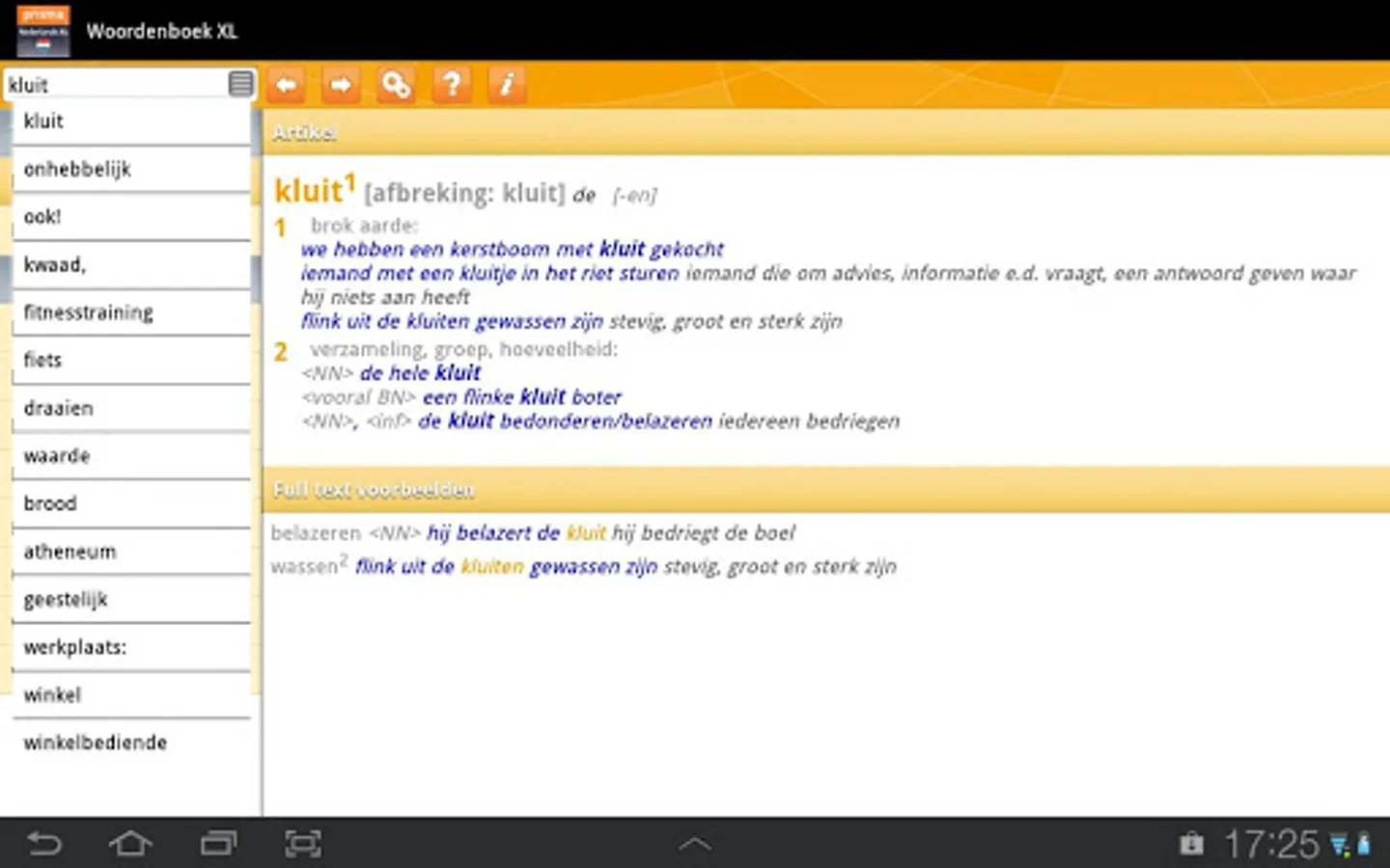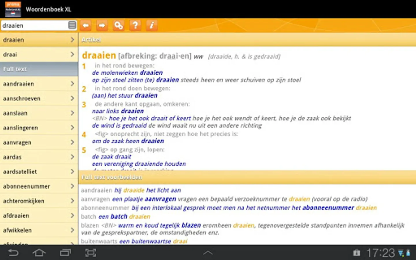 • Full text search result: search a word once and you will immediately see all the times it occurs in the dictionary, in all example sentences and translations, complete and clear. This way you choose the right word in every situation.
