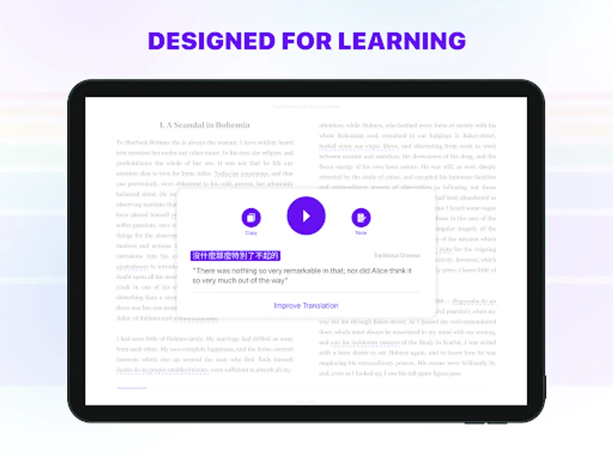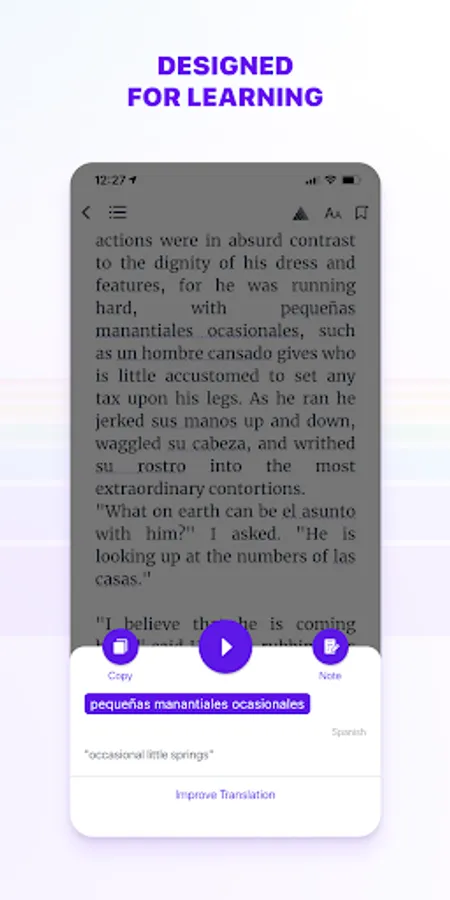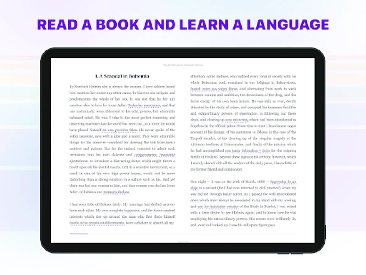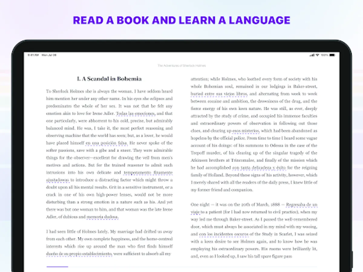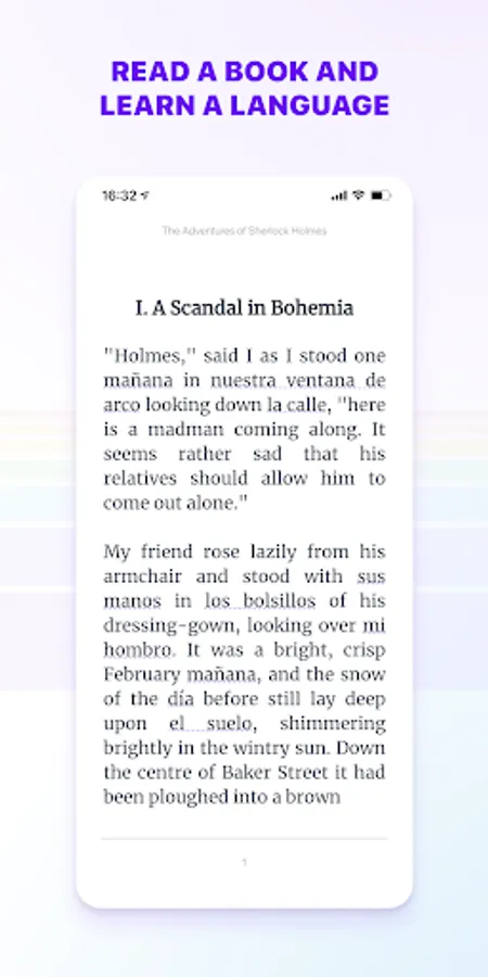 At the start of a Prismatext book, you'll be reading in English. Very shortly thereafter, you'll be reading in English and a little bit of your target language. Prismatext will begin replacing words and phrases with their translations—not too many, of course, but enough for you to notice. If you get stuck, give the words a tap to bring up their footnote: you'll find their meaning there, as well as a way to hear those same words spoken.