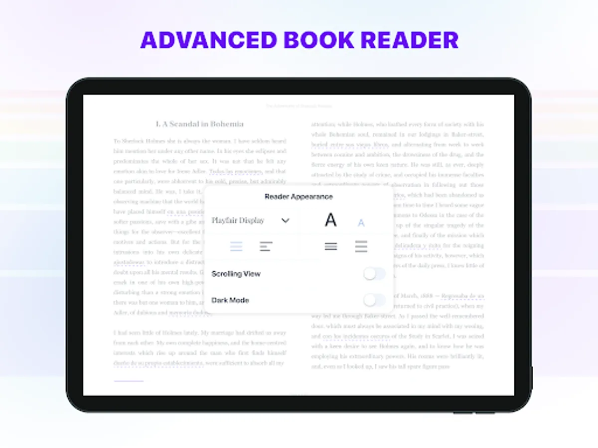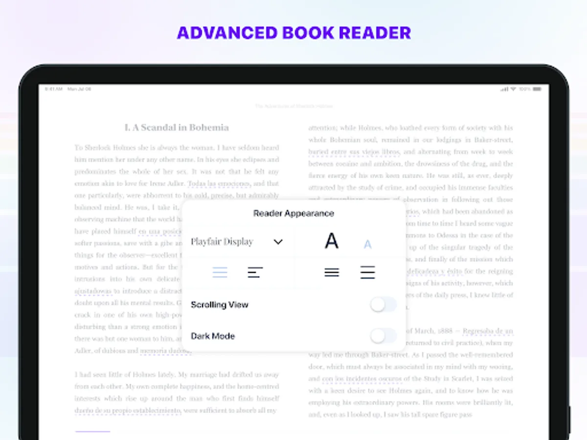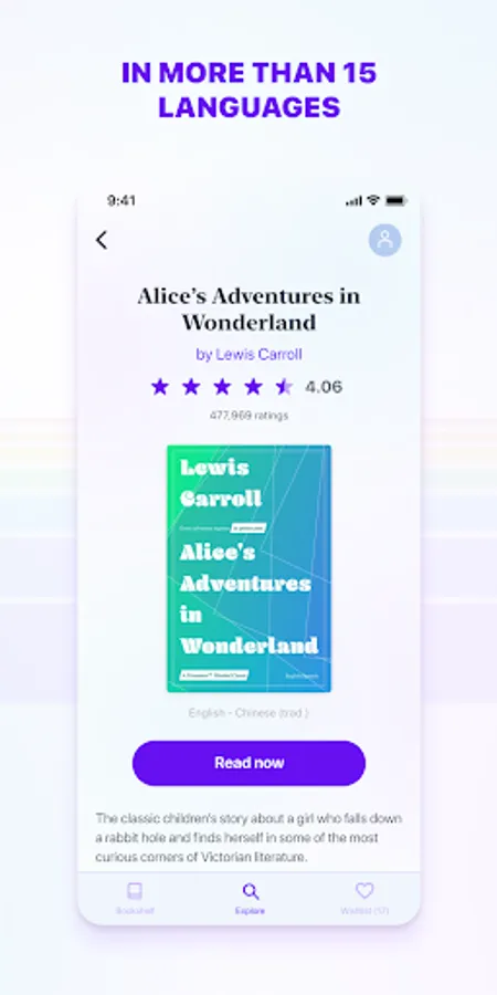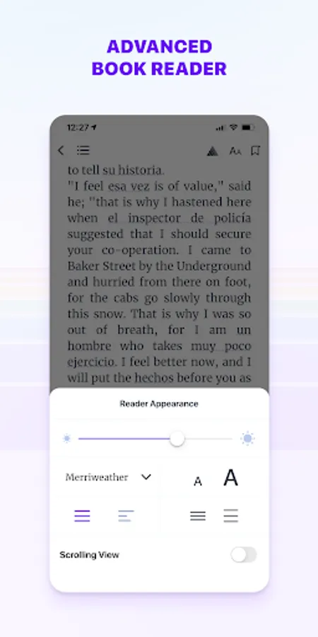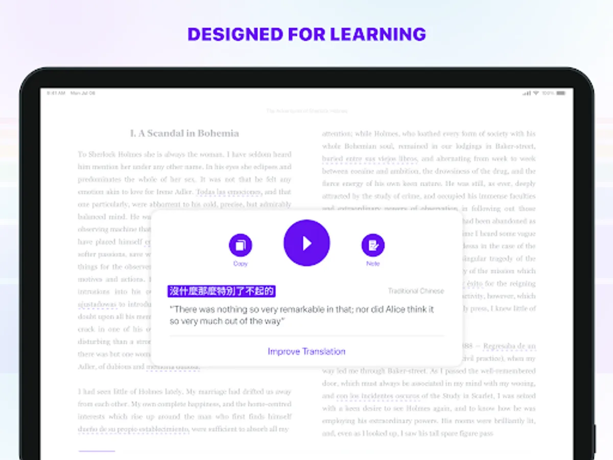 At the start of a Prismatext book, you'll be reading in English. Very shortly thereafter, you'll be reading in English and a little bit of your target language. Prismatext will begin replacing words and phrases with their translations—not too many, of course, but enough for you to notice. If you get stuck, give the words a tap to bring up their footnote: you'll find their meaning there, as well as a way to hear those same words spoken.