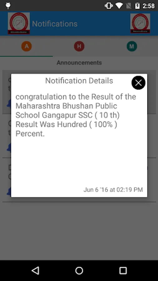 • Notification: Schools are able to send messages to parents regarding Daily Homework, School Announcements or even specific message. Parents can set reminder against each notification they receive. School is also able to send attachments like document, excel, image, PDF etc. along with messages.