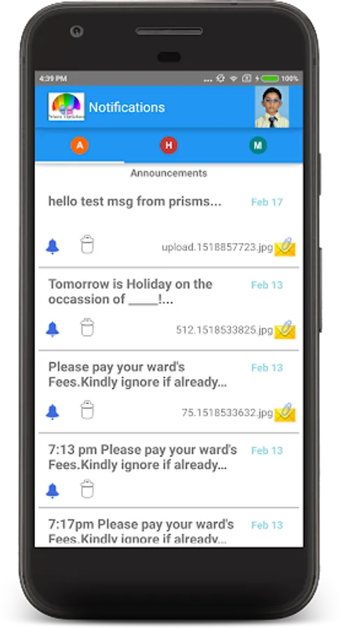 • Notification: Schools are able to send messages to parents regarding Daily Homework, School Announcements or even specific message. Parents can set reminder against each notification they receive. School is also able to send attachments like document, excel, image, PDF etc. along with messages.
