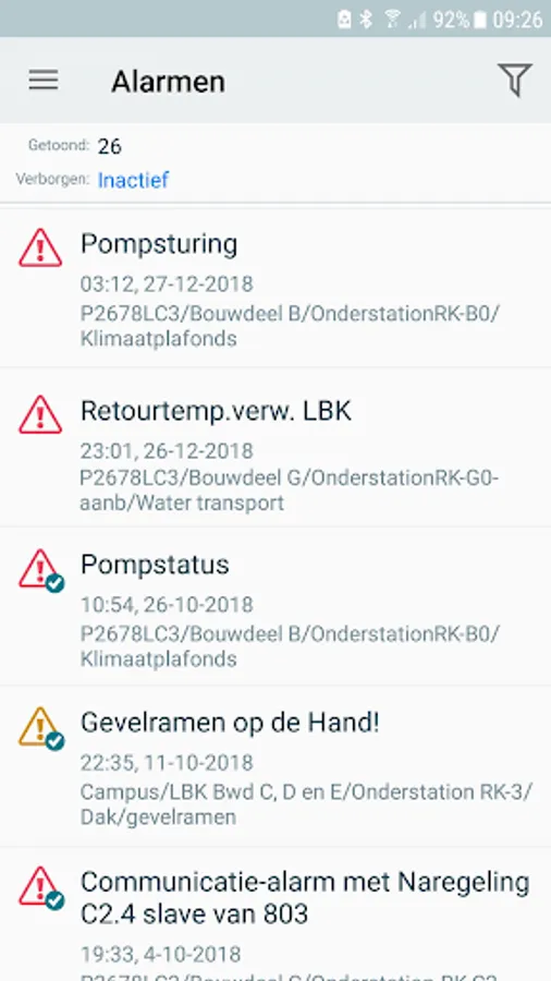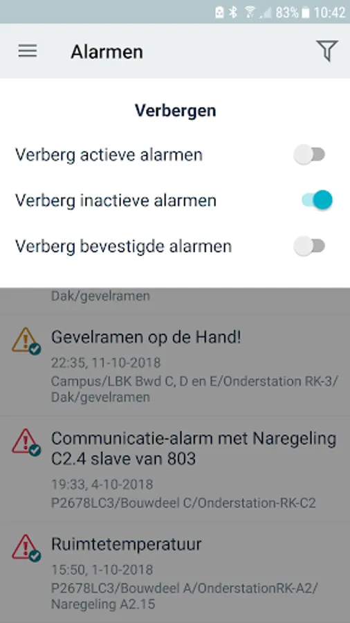 With this App, the alarm information of your Priva systems is available anywhere, at any time. The Priva Alarms application provides an overview of the alarms in the Priva systems in your Buildings and/or Greenhouses and offers greater insight and flexibility on the go. It alerts you when an alarm occurs and offers detailed information on the nature of the alert. With the Priva Alarms App you can also acknowledge the alarms.
