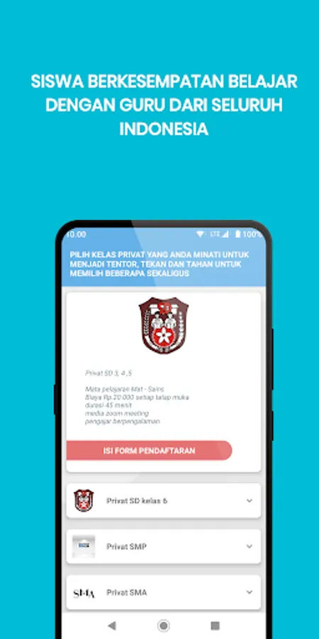 Version 1.0 puts forward the functions of student registration, free ebooks, learning videos, and free tryouts. there are many choices of private classes ranging from school learning, reading and writing, to reading the Koran under the guidance of a provisional teacher at a very affordable cost