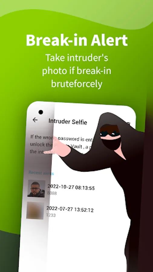 - Turn on the alert and it will automatically take a photo of the intruder who fails to unlock the photo vault.