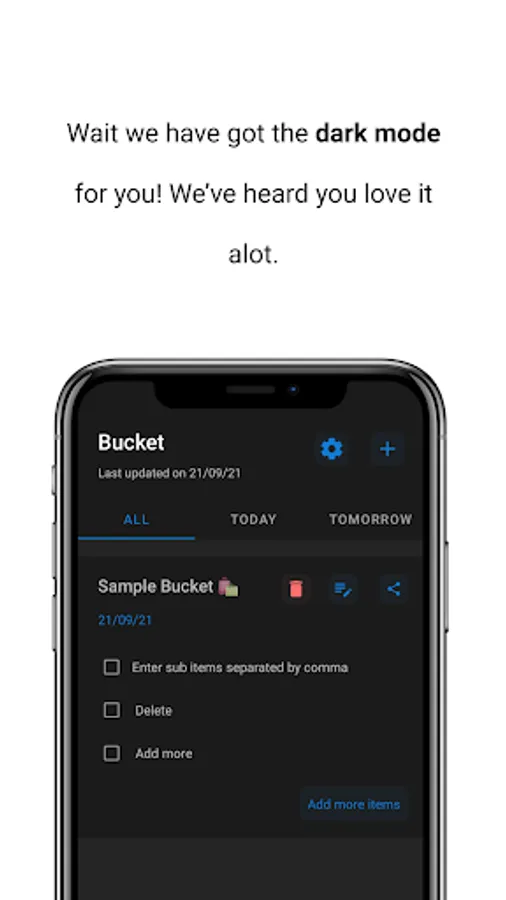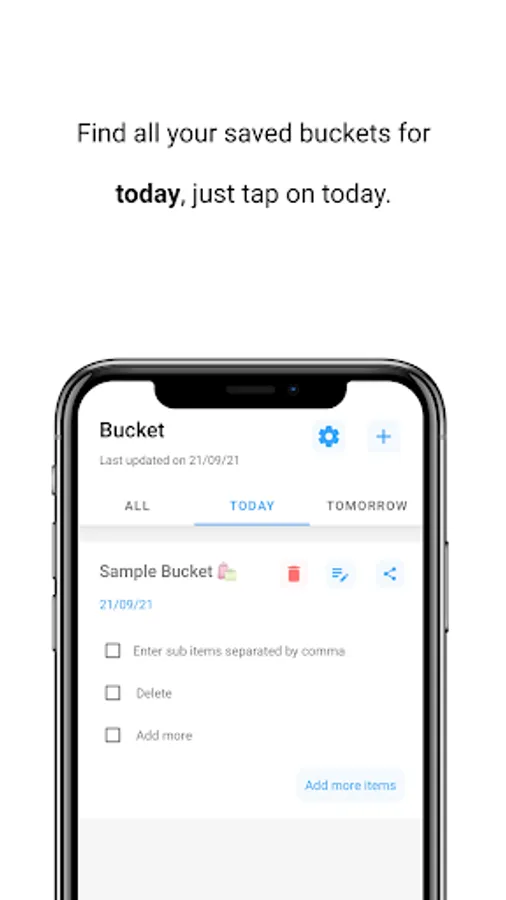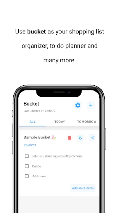 All tab contains all the shopping or to-do list you have stored inside the app. While creating a new bucket you must have selected a date according to with today and tomorrow tabs will be populated. When you are going for shopping just check the today tab and you will find all the items listed for todays date.