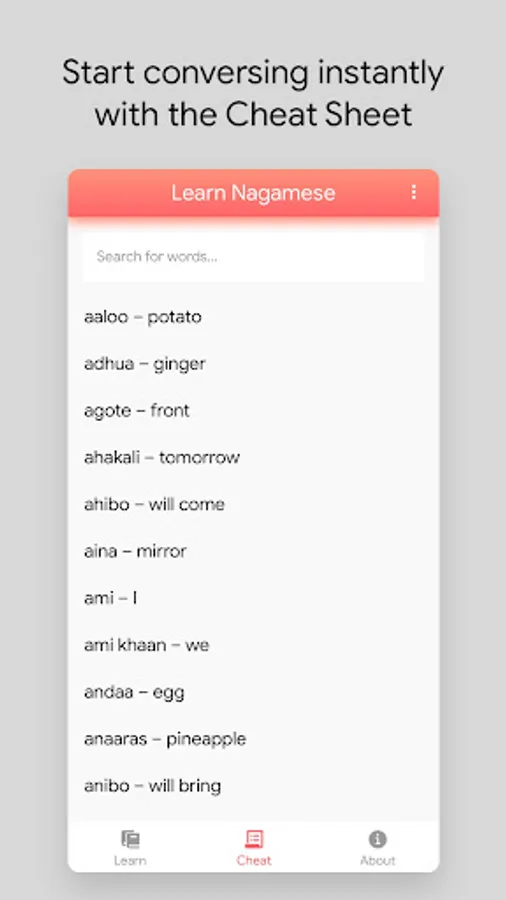 Learn Nagamese is the best and probably the only app out there that enables you to learn the Nagamese dialect in a fun and engaging way. Start conversing with your Naga friends and acquaintances instantly. It’s fun, effective and addictive.
