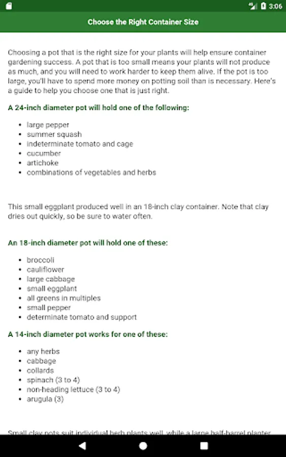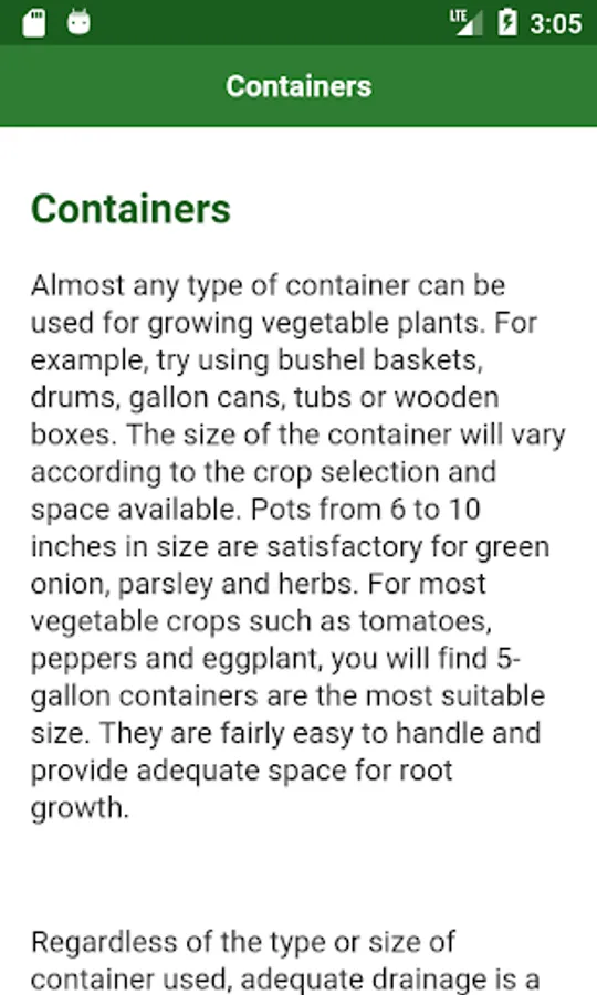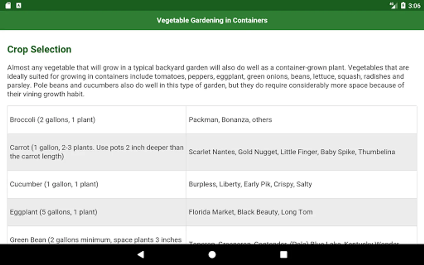 Learn how to grow container vegetables in your home garden from this app. You can raise substantial amounts of many edibles in containers on a patio, deck, porch or balcony. Container gardening has grown rapidly recently and we have developed an increasing number of compact and dwarf varieties intended to succeed in small spaces. Containers also make it easier for you to control the soil, light, water and fertilizer.