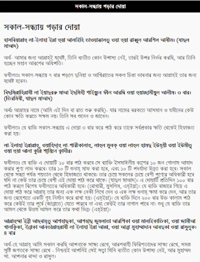 দোয়া ও জিকির অ্যাপ থেকে নিজের দোয়া এবং জিকির গুলো সহজেই বাংলা উচ্চারণ ও অর্থ সহ জানা যাবে। এবং বিভিন্ন দরকারী সময় পড়া যাবেঃ