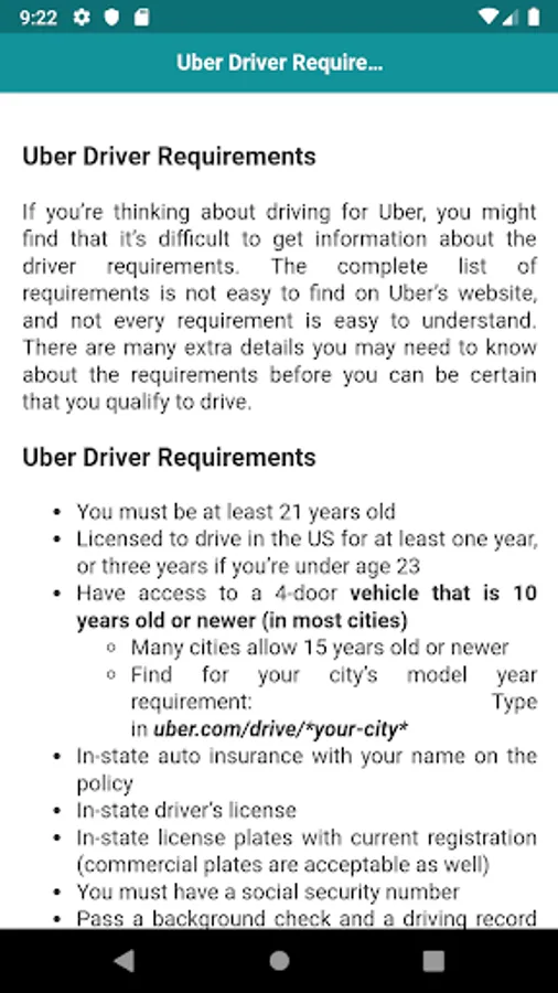 Learn how to become a driver for Uber. Get essential information in your hand. Resources in this app will help you understand the process and get started as a Uber driver.