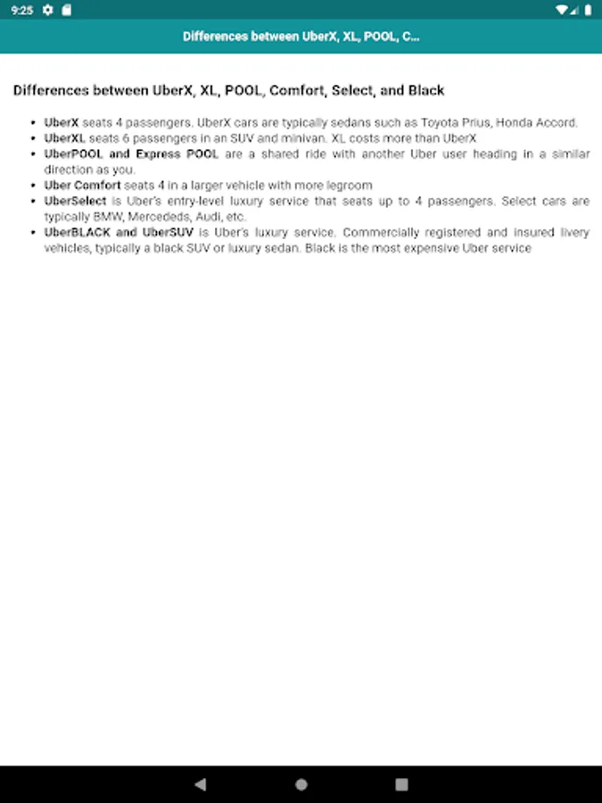# Differences between UberX, XL, POOL, Comfort, Select, and Black.