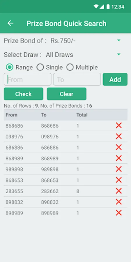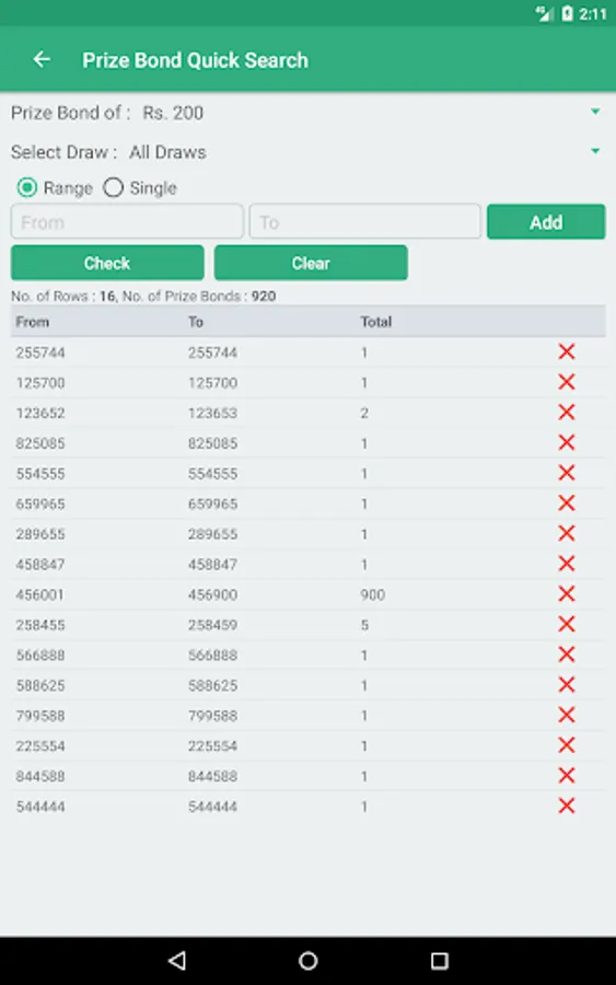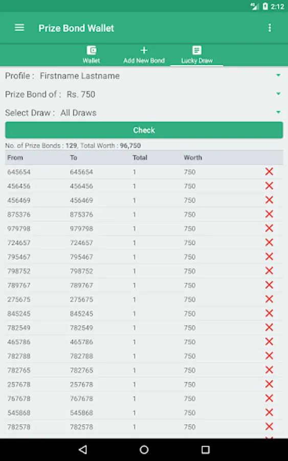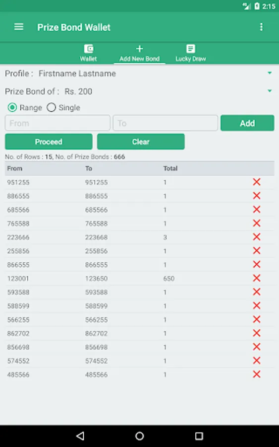To remove prize bond numbers, select "Lucky Draw" menu. Click "Remove Icon" and confirming the action.