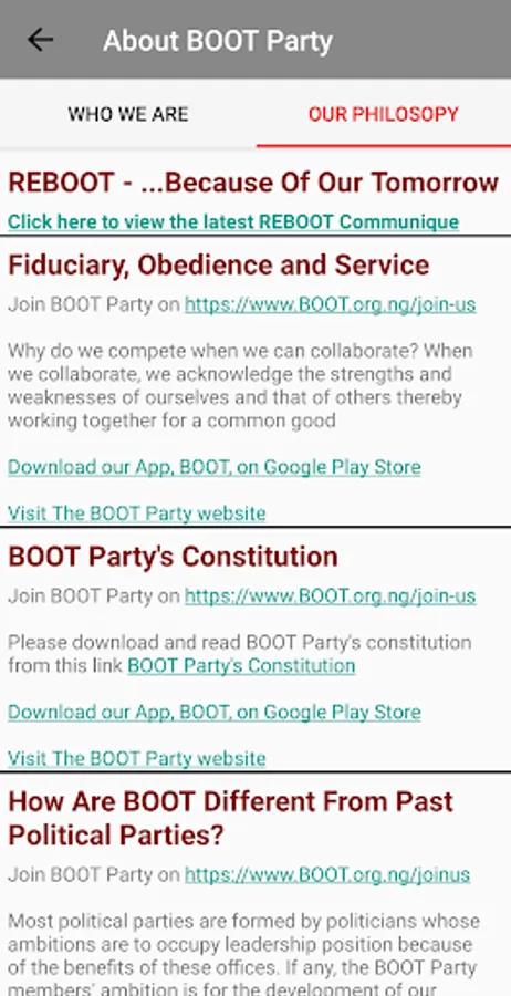 The BOOT Party App is a communication tool for BOOT Party members and will be used for conducting BOOT Party Election Primaries.