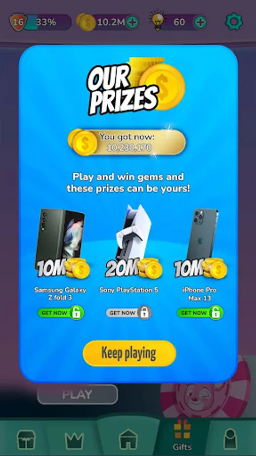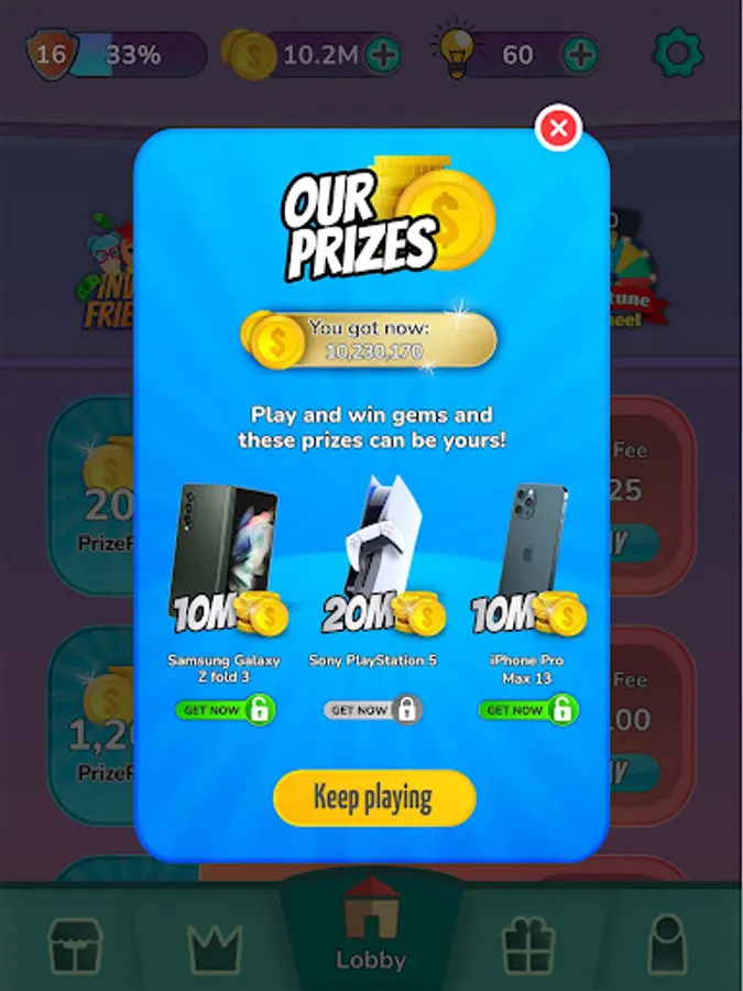 To win the game and win gems you will have to discover as many words as possible from the letters stack you will receive at each level, it is not going to be simple because you will have to do it in a shorter time than competitors in the room and they are not going to give up easily.