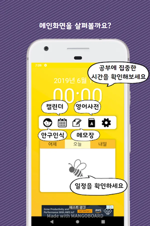 Eye recognition using the front camera wakes up the user with alarm and vibration.