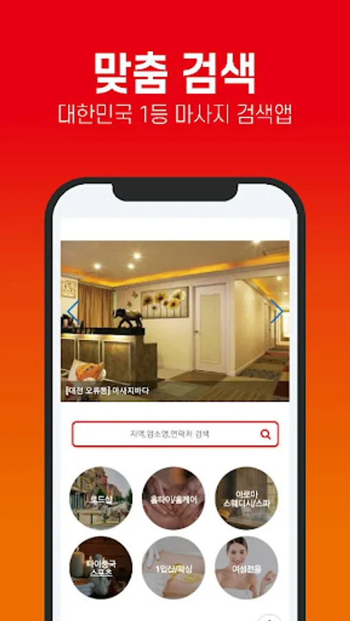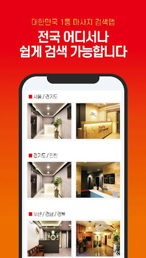 Now you can get a massage with a high discount. Seoul, Incheon, Gyeongsang-do, Gwangju, Daejeon, Daegu, Sejong, Busan, Ulsan, Jeolla-do, Chungcheong-do, Gapyeong, Goyang, Gwacheon, Gwangmyeong, Gyeonggi-gwangju, Guri, Gunpo, Gimpo, Namyangju, Dongducheon, Bucheon, Seongnam , Suwon, Siheung, Ansan, Anyang, Yongin, Pyeongtaek, etc. Massage shop information application that can be used nationwide. Choose the area you want, or your surroundings, and easily search for massages (Thai massage, aroma massage, foot massage) or skin care (waxing, skin care, skin care) that suit you, and select and receive benefits while receiving massage can receive.