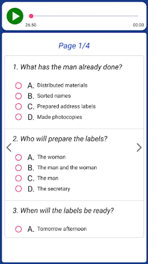 "Listening Prep - TOEIC® Test" app provide free model practice test covered all 4 topics of listening section preparation with solution. This app containn basically 4 parts like picture, question-response, short conversations and short talk.