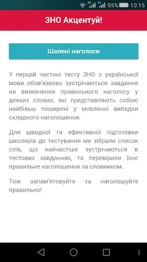 Питання про наголоси – майже 100% буде на ЗНО і завжди є одним з найскладніших. Цей додаток допоможе вам запам'ятати основні проблемні для наголошення слова.
