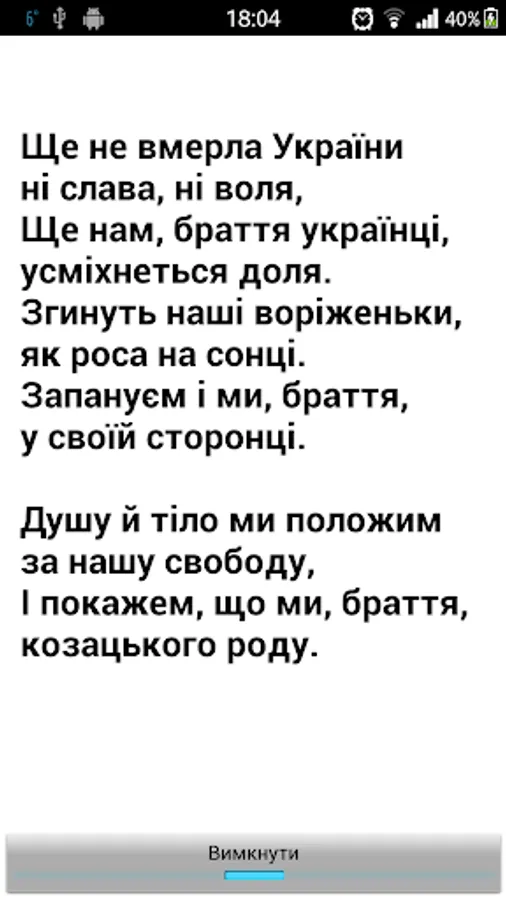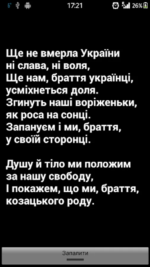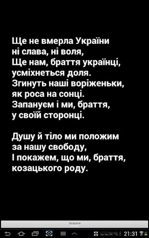 This program will help you when the National Anthem of Ukraine is played. I does not only displays the text of Anthem, but you can also switch on the flashlight - particularly useful at the EuroMaydan, Olympic Games, concerts, football, boxing, etc.