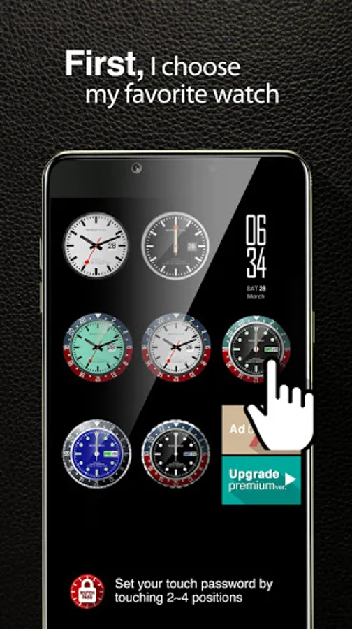 Display a cool Watch image on my cell phone screen and use it as a quick and simple way to unlock by touching specific positions of the watch!!