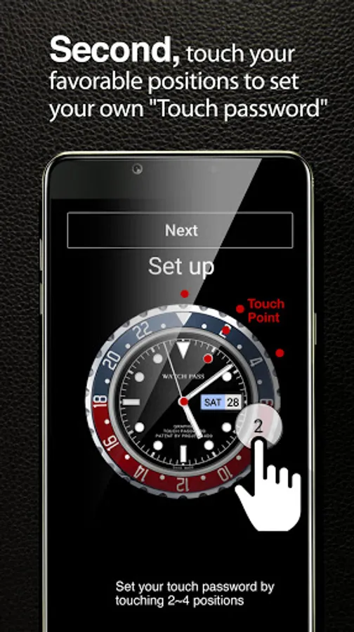 The Watch-pass can simply set a "touch password" with the touch of specific positions on watch image.