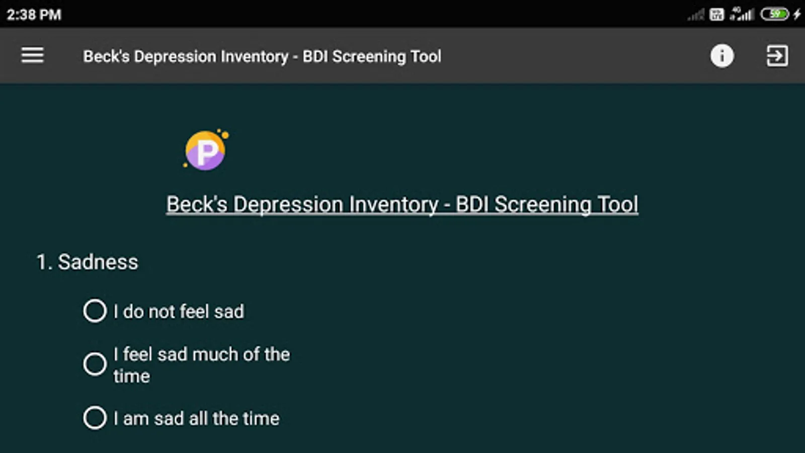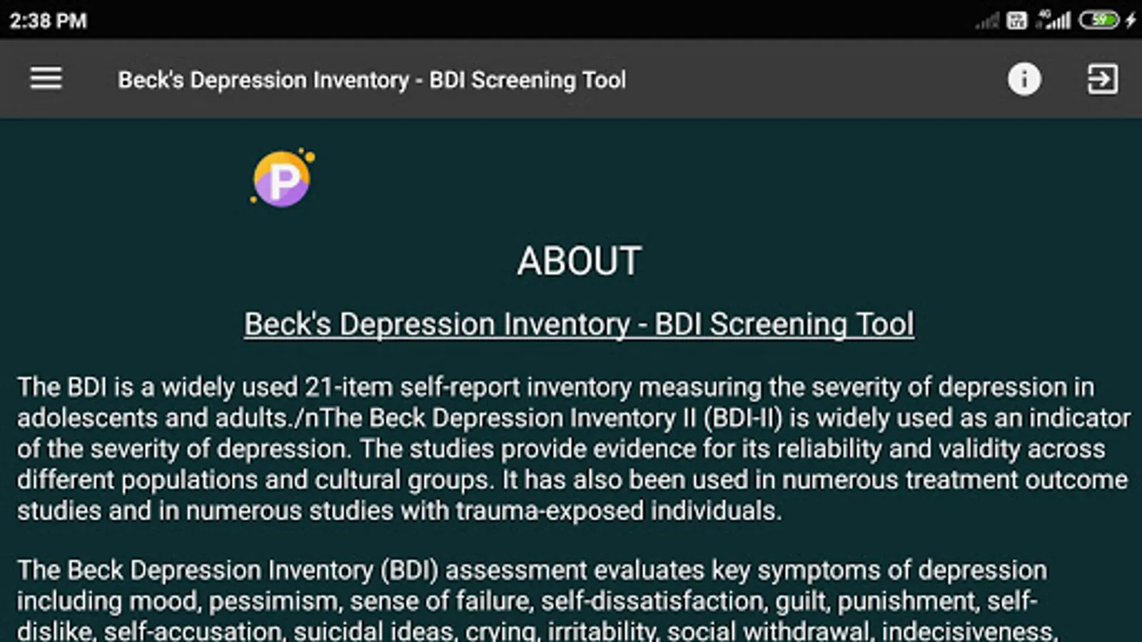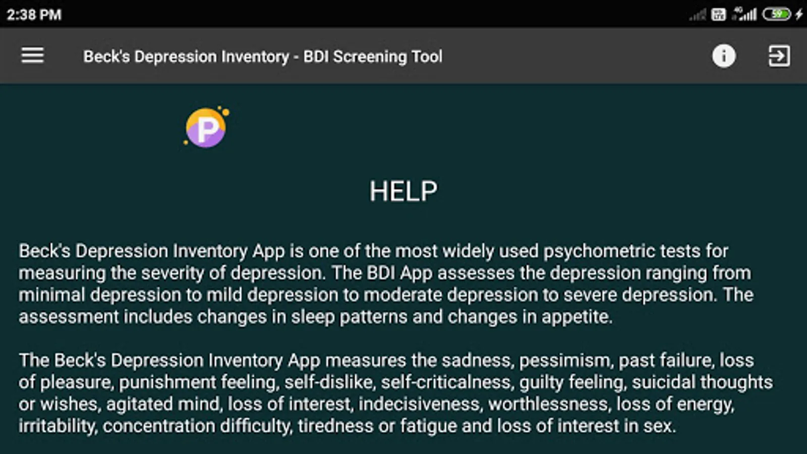 Beck's Depression Inventory App is one of the most widely used psychometric tests for measuring the severity of depression. The BDI App assesses the depression ranging from minimal depression to mild depression to moderate depression to severe depression. The assessment includes changes in sleep patterns and changes in appetite.