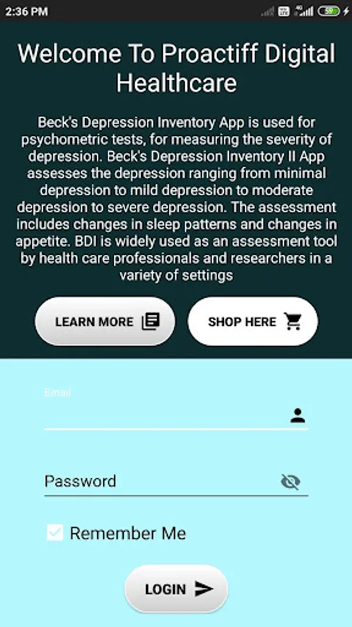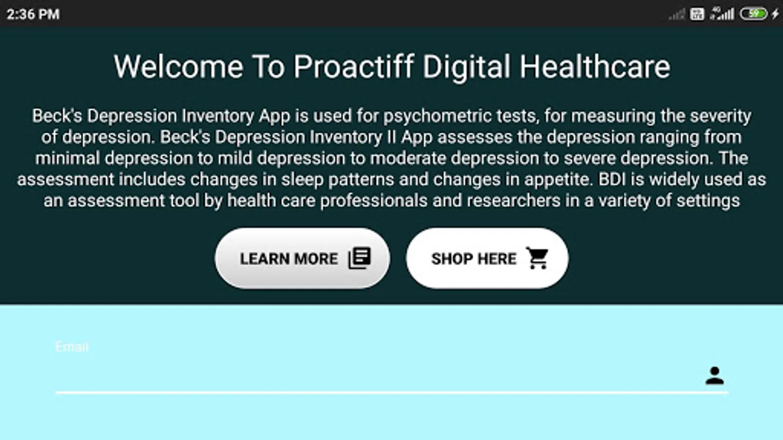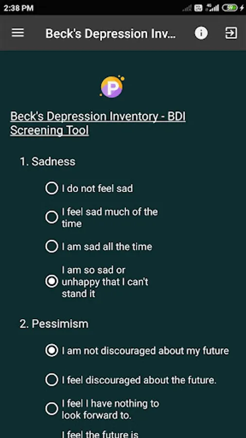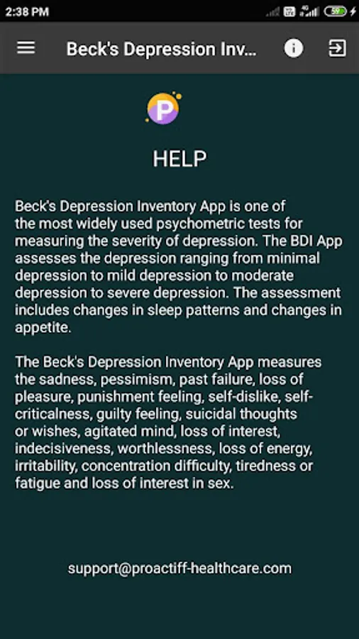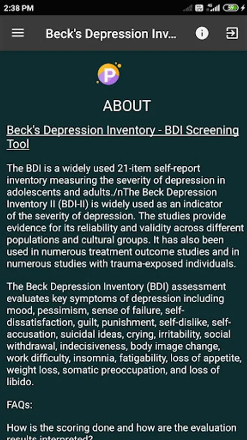 Beck's Depression Inventory App is one of the most widely used psychometric tests for measuring the severity of depression. The BDI App assesses the depression ranging from minimal depression to mild depression to moderate depression to severe depression. The assessment includes changes in sleep patterns and changes in appetite.