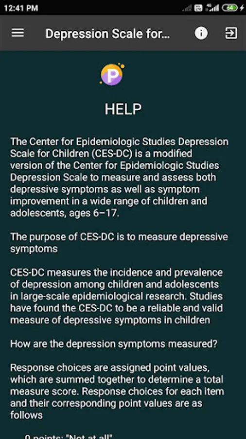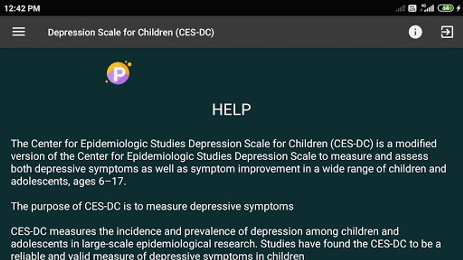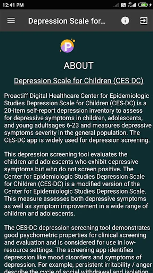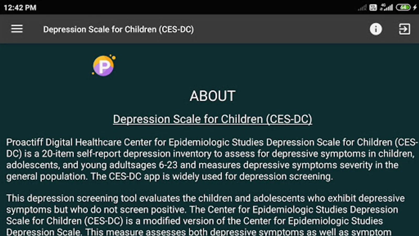 Proactiff Digital Healthcare Center for Epidemiologic Studies Depression Scale for Children (CES-DC) is a 20-item self-report depression inventory to assess for depressive symptoms in children, adolescents, and young adultsages 6-23 and measures depressive symptoms severity in the general population. The CES-DC app is widely used for depression screening.
