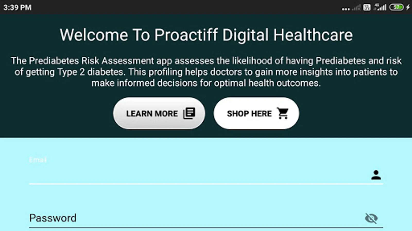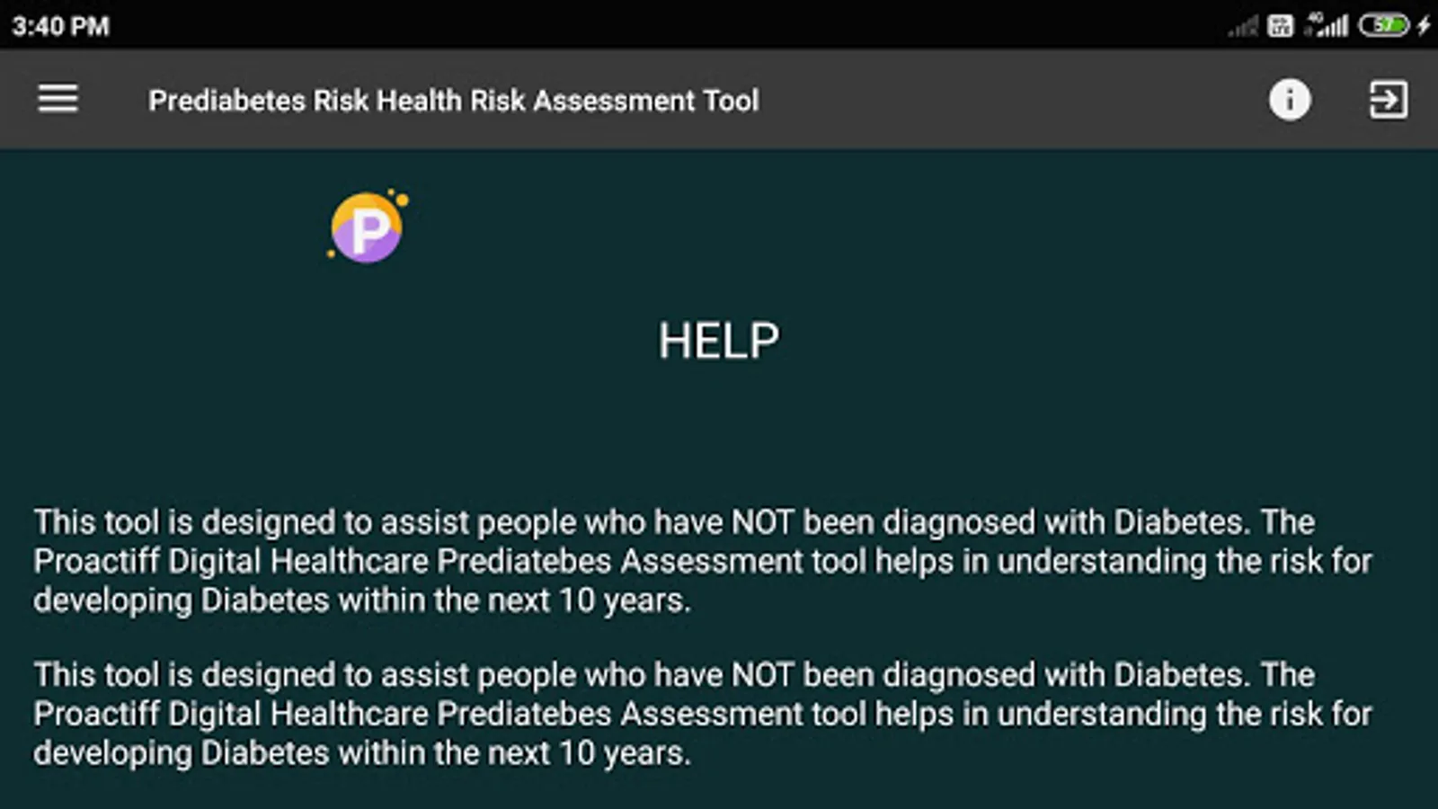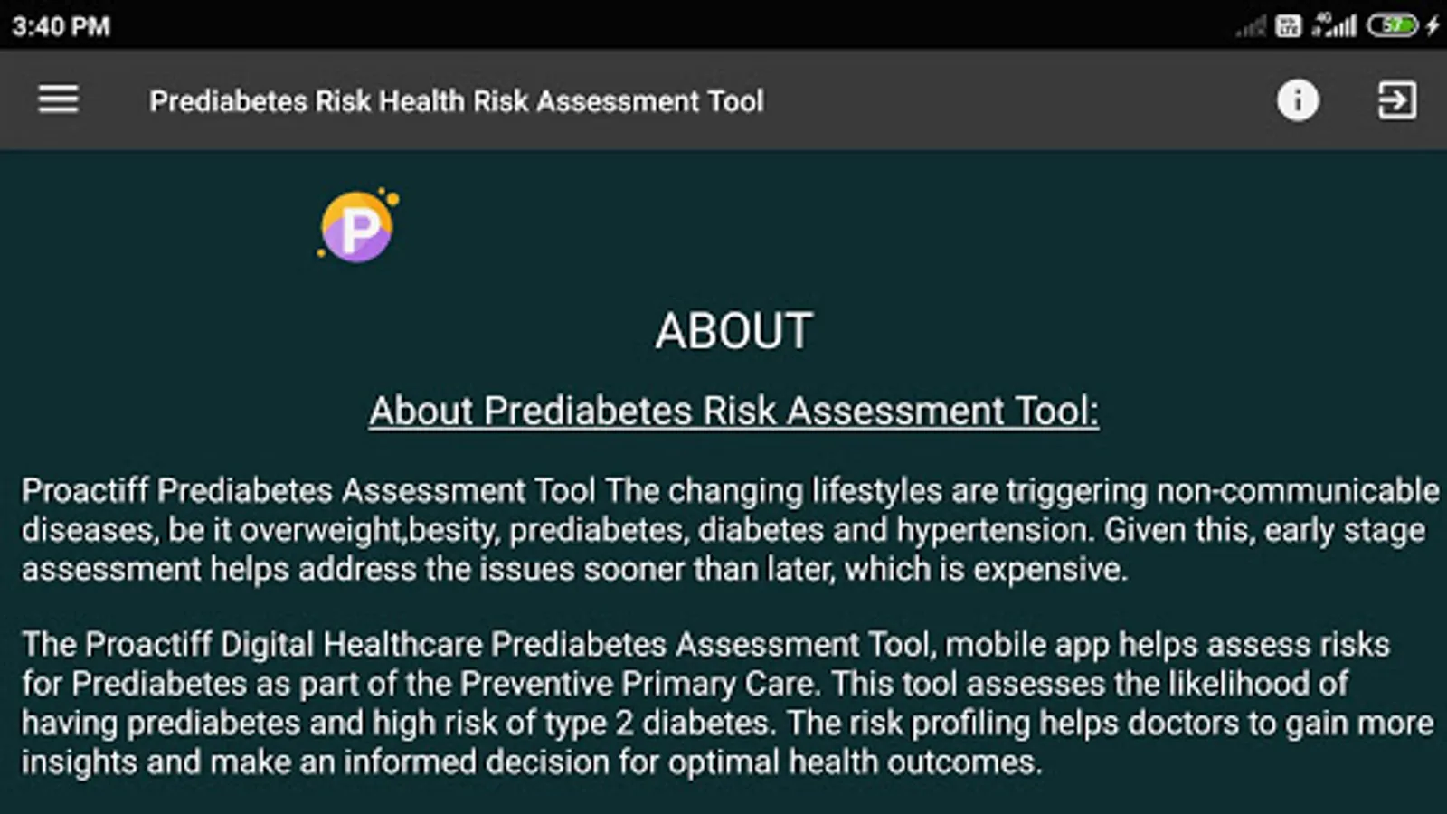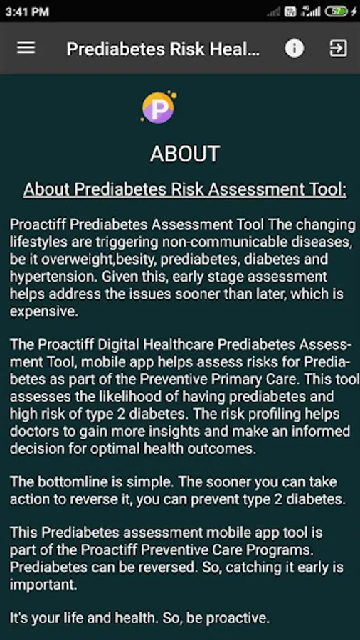 The Proactiff Digital Healthcare Prediabetes Assessment Tool, mobile app helps assess risks for Prediabetes as part of the Preventive Primary Care. This tool assesses the likelihood of having prediabetes and high risk of type 2 diabetes. The risk profiling helps doctors to gain more insights and make an informed decision for optimal health outcomes.