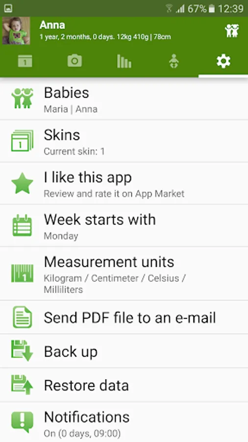 All the main functions are accessible via the calendar. Tapping a finger on the calendar date, you can add and edit the settings for each day.