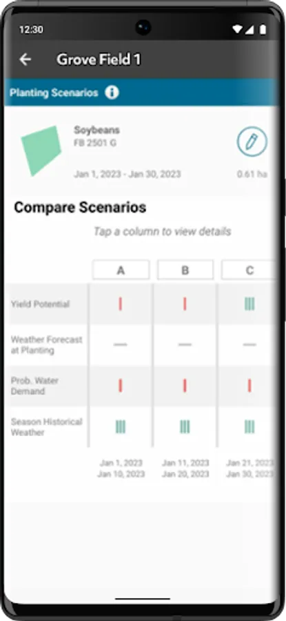 Smart Ag Nation will provide an assessment of your planting recommendation, plan or work order and provide a rating on many factors including Yield Potential, Weather Forecast at Planting, Probability of Water Demand and Seasonal Historic Weather. These scenarios can be viewed for a single field on the field dashboard or across all fields in the grower or farm on their respective dashboards.