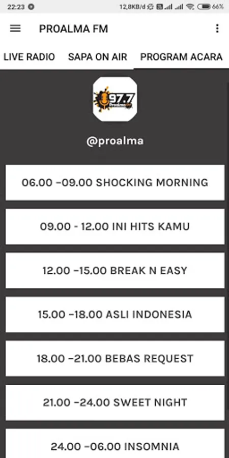 Radio Proalma 97.7 FM, which has been broadcasting since March 19, 2001, as one of the leading private radio stations in Semarang. Proalma FM embraces students, students, productive workers and young professionals with a fresher and more intimate style and atmosphere, and always provides what they need. With the power of the latest broadcasting technology and integration in media convergence, through website, streaming, podcasting and the power of social media, ProAlma FM is committed to providing the best for Paramuda Semarang.